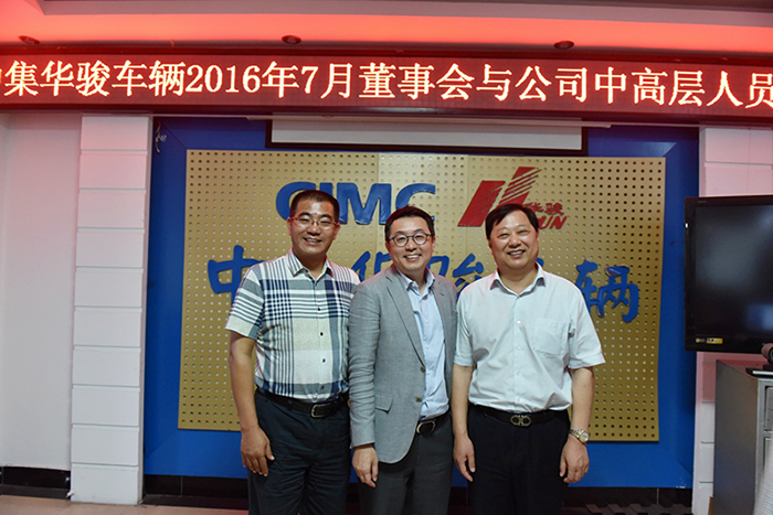2016年7月27日下午15:50,中集華駿車輛2016年第二次董事會暨新一屆董事會與公司中高層溝通會在工業(yè)園職工餐廳二樓會議室召開。會議由中集車輛集團(tuán)總經(jīng)理/華駿車輛董事長李貴平先生主持。會議宣布郭喜洲先生當(dāng)選中集華駿車輛新任總經(jīng)理、郭永華先生擔(dān)任公司新一屆董事會董事長。